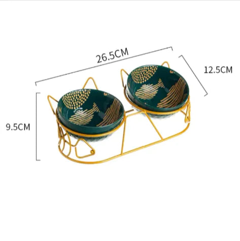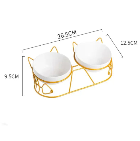 Elevated ceramic double bowl set with a stylish cat-ear stand, designed for cats and small to medium dogs. Features an angled design for comfortable feeding. Available in various colors with gold or black cat-ear accents.